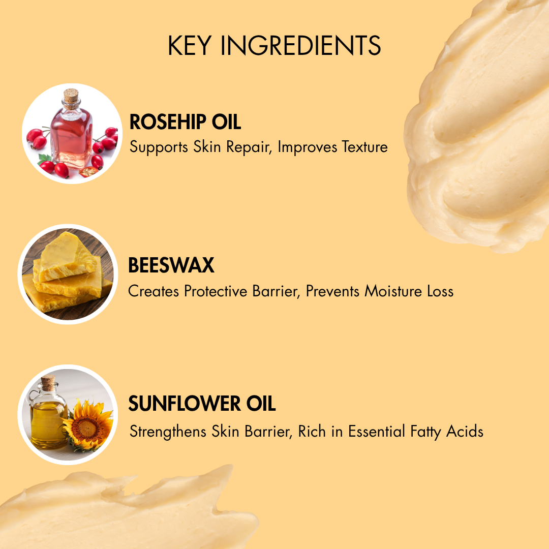 Organic coconut oil, Organic shea butter, Organic cocoa butter, Organic grapeseed oil, Organic beeswax, Organic hemp seed oil, Organic sunflower oil, Organic rosehip oil, Natural Vitamin E, Organic rosemary extract.